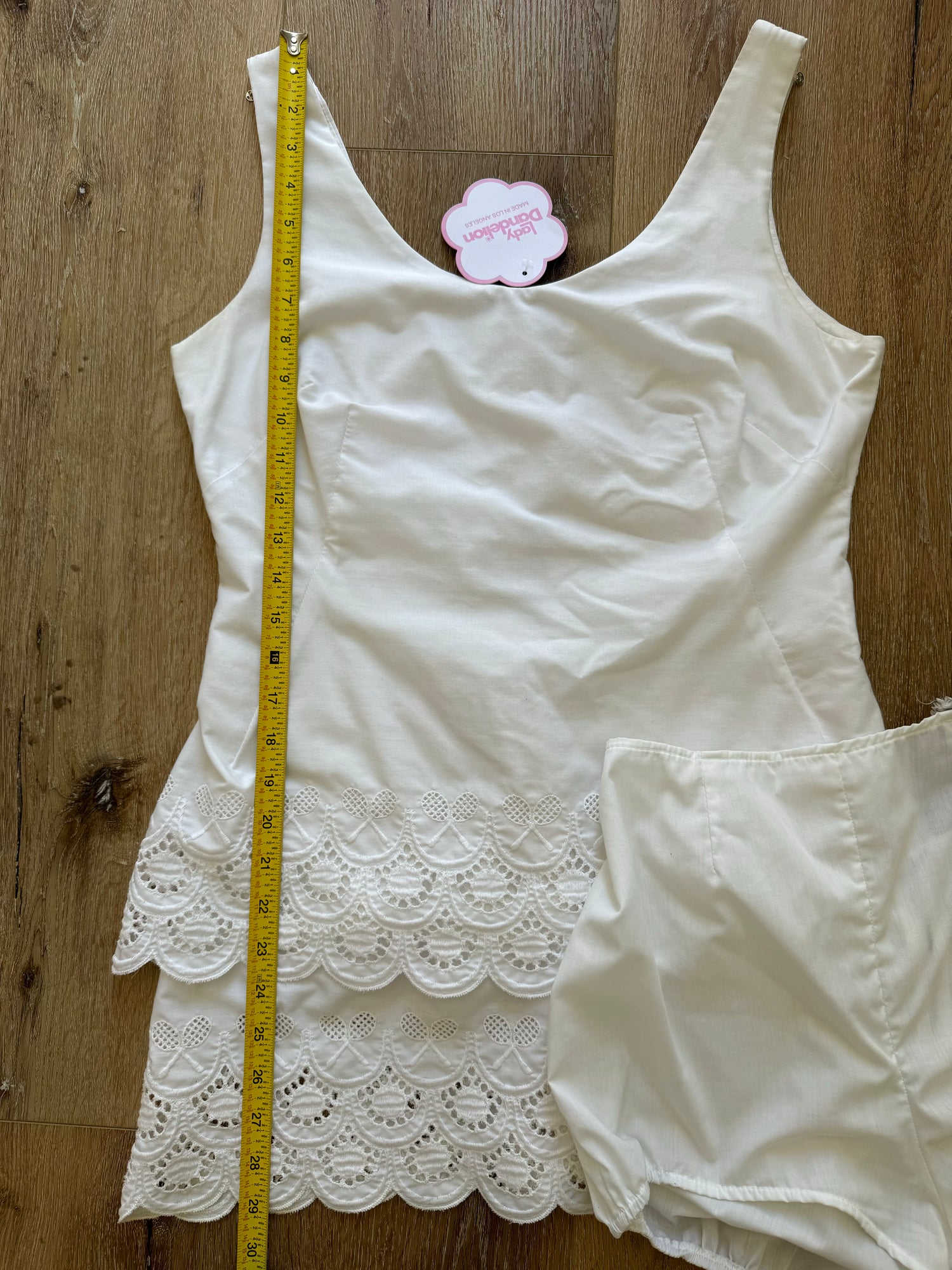 Beautiful vintage cotton tennis costume. Dress has eyelet detail and tennis rackets across the bottom hemline. Zip up in back. Set come complete with matching bloomers. Best fits a size medium or 6/8. All vintage sales are final.