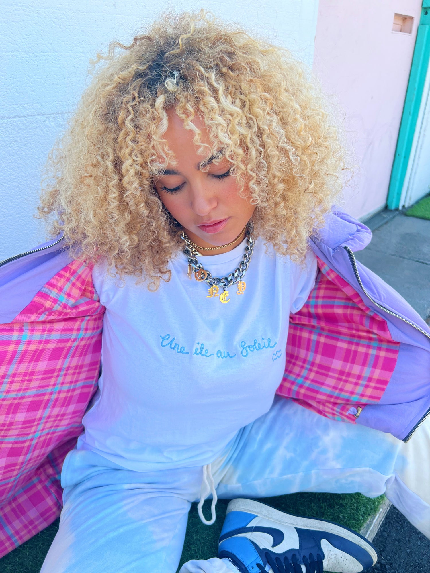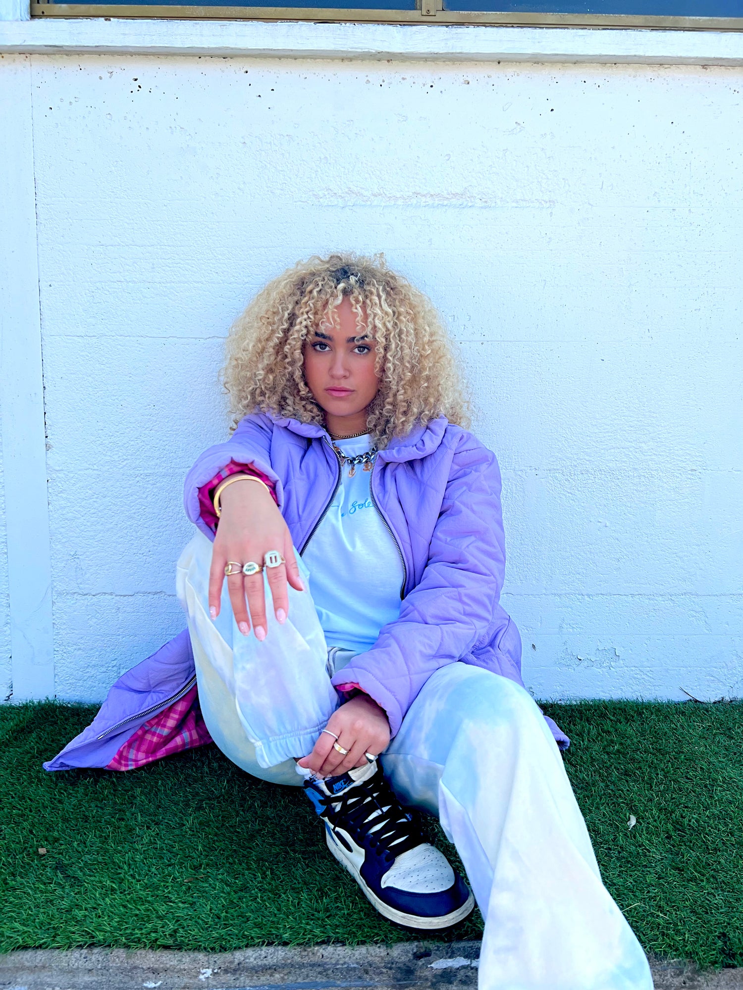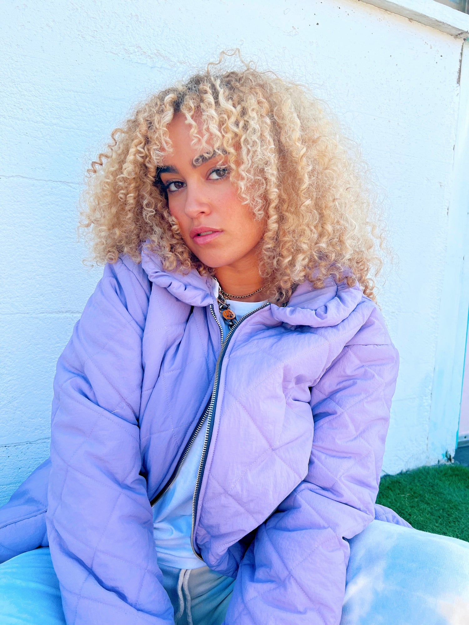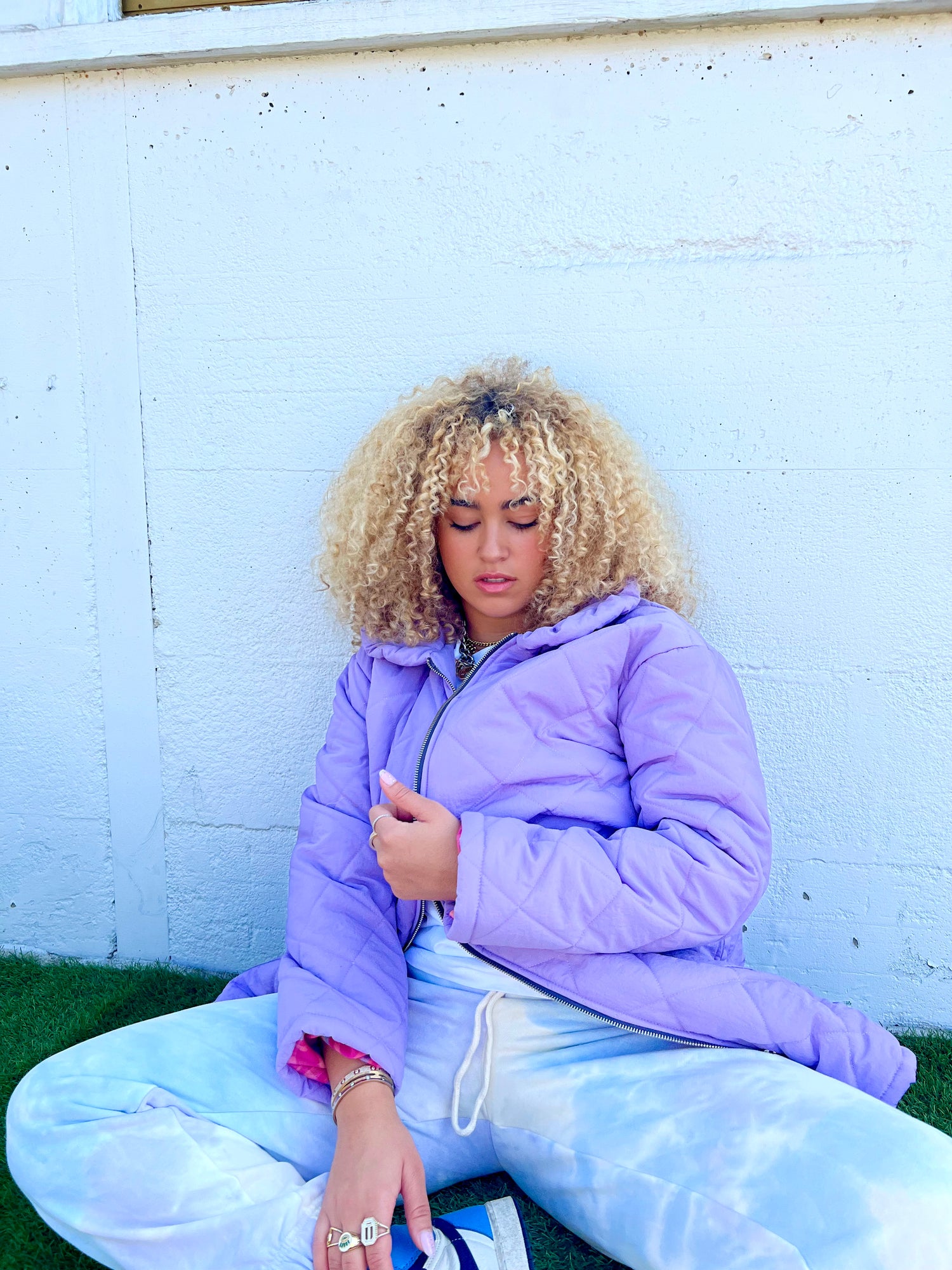 Violet waterproof rain coat with pink plaid flannel interior. Zip up front, feminine ruffle collar detail. Made in Uruguay by Tach Clothing.