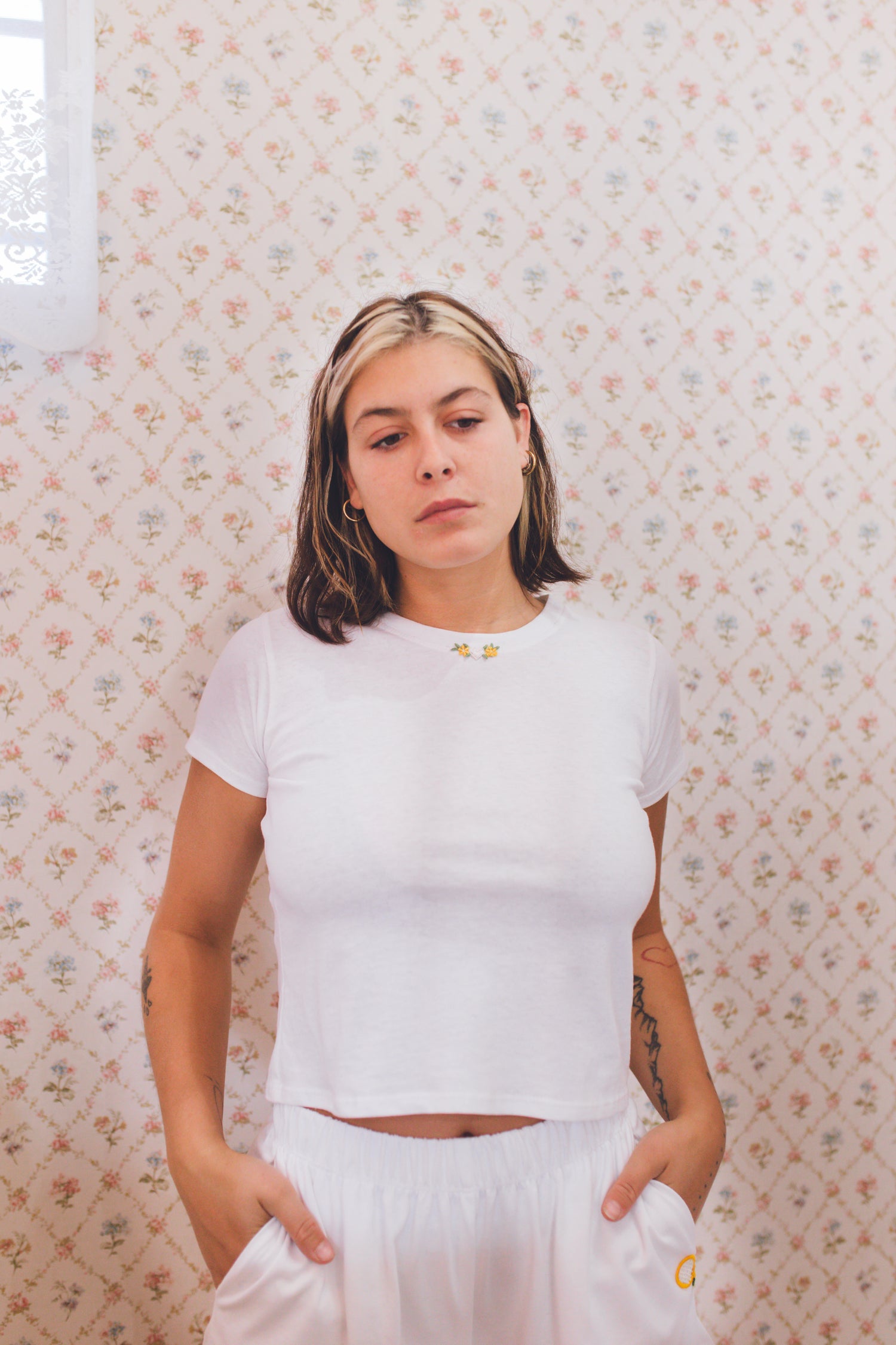 Our classic Pocket Tee, minus the pocket. Made in 100% dead stock cotton with a vintage flower embroidery at center collar. This tee is not cropped but hits right at your pant waistline. Classic with a sweet twist.