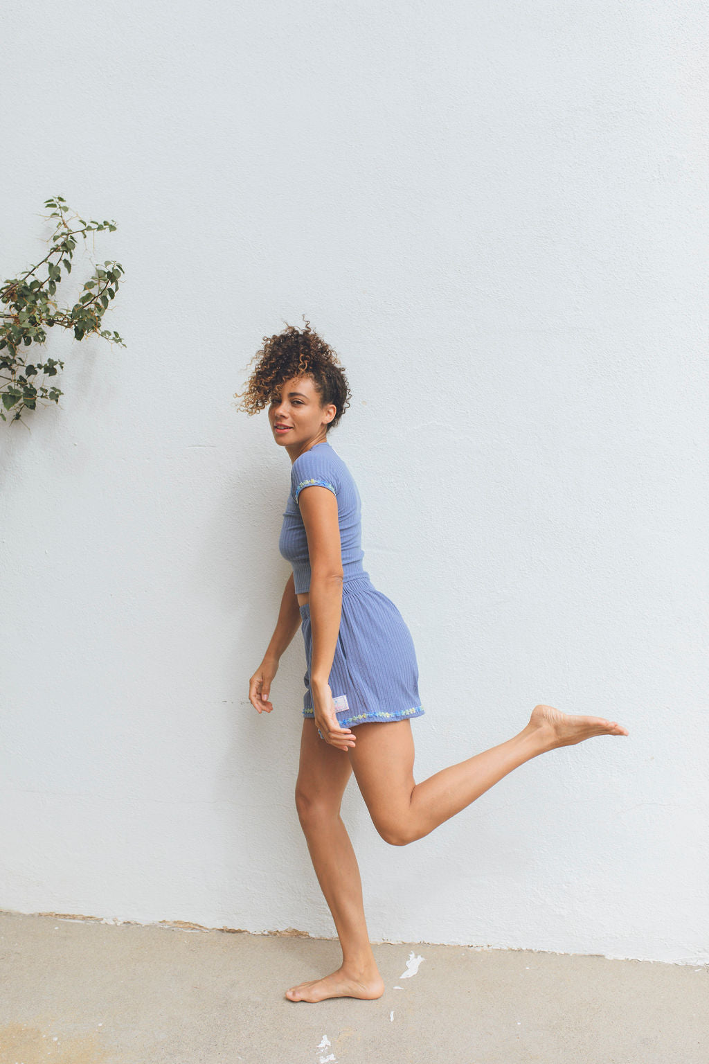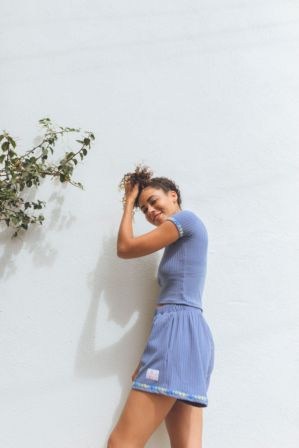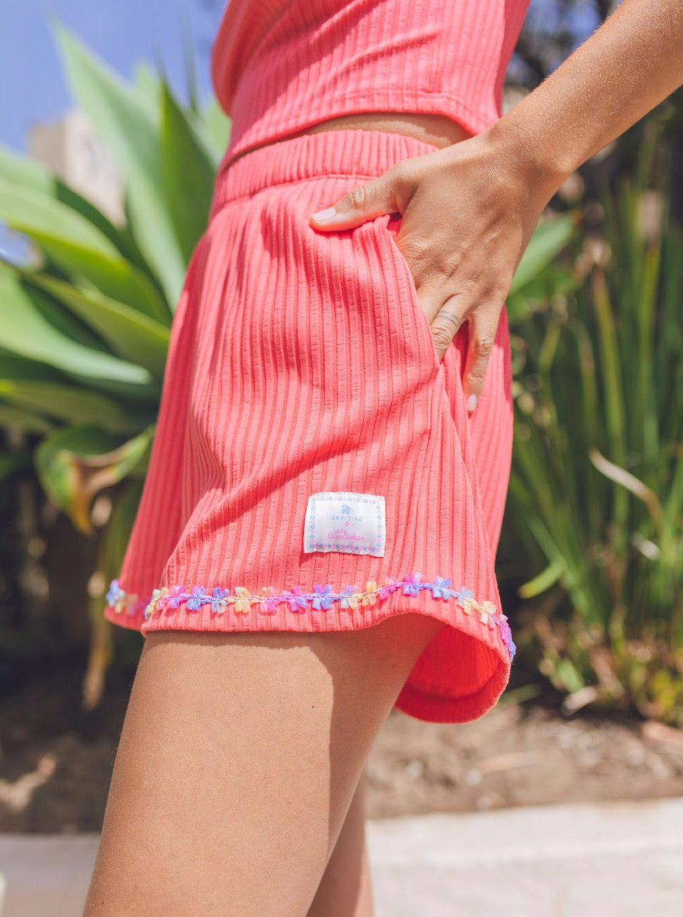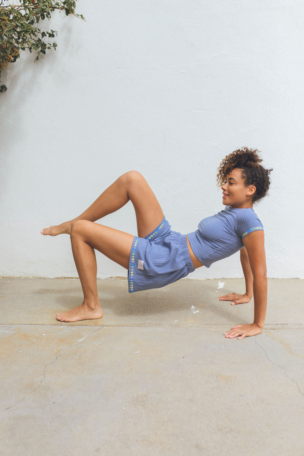 Our elastic high waist Hawaii Shorts are breezy, sexy, and comfy, so you can wear them to work out, and keep them on through the rest of your day. This collab features a vintage trim on the seam and custom design labels for SKYTING x Lady Dandelion. And of course we added pockets for you. Our favorite sneaky secret.