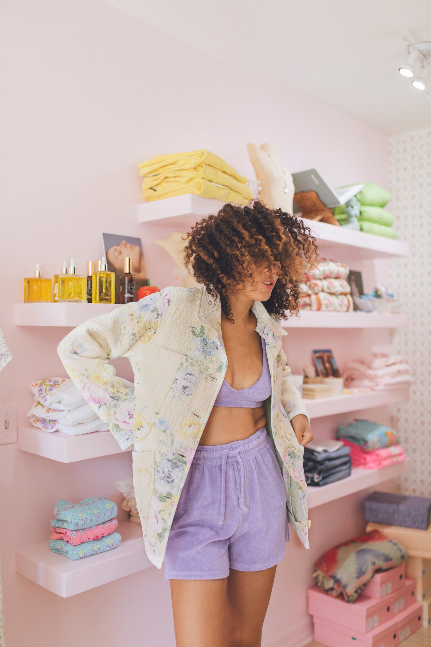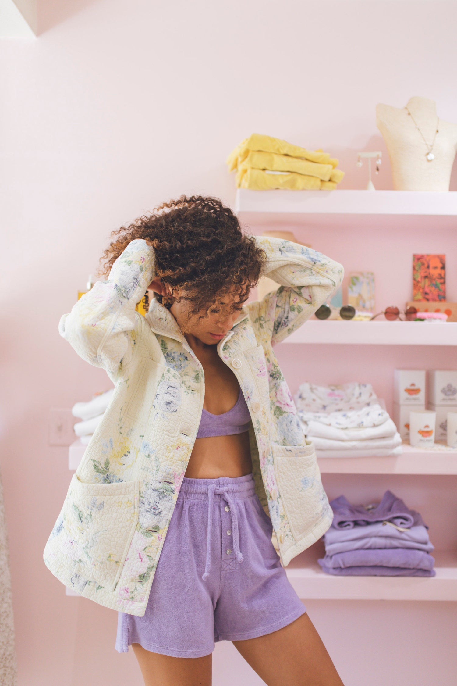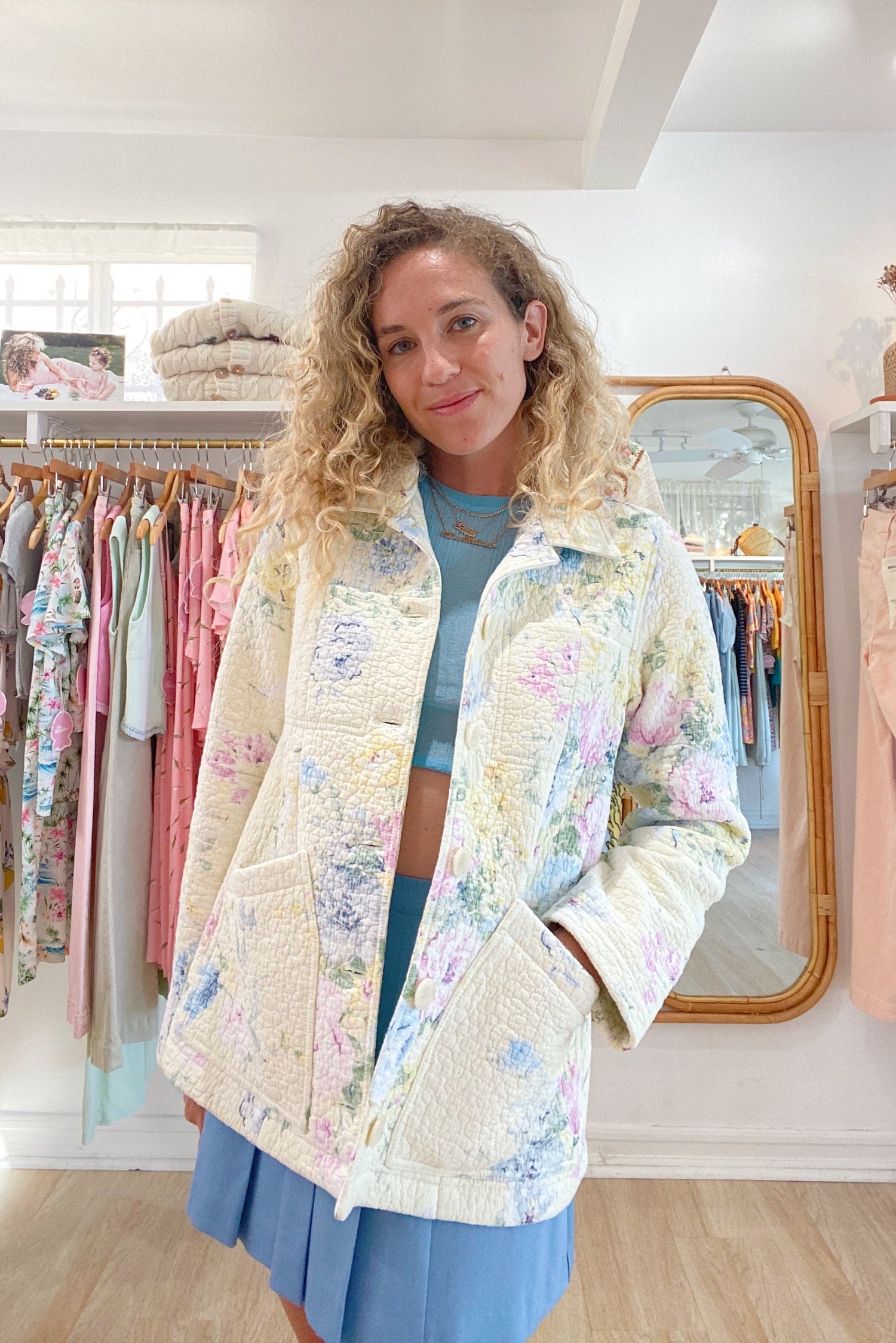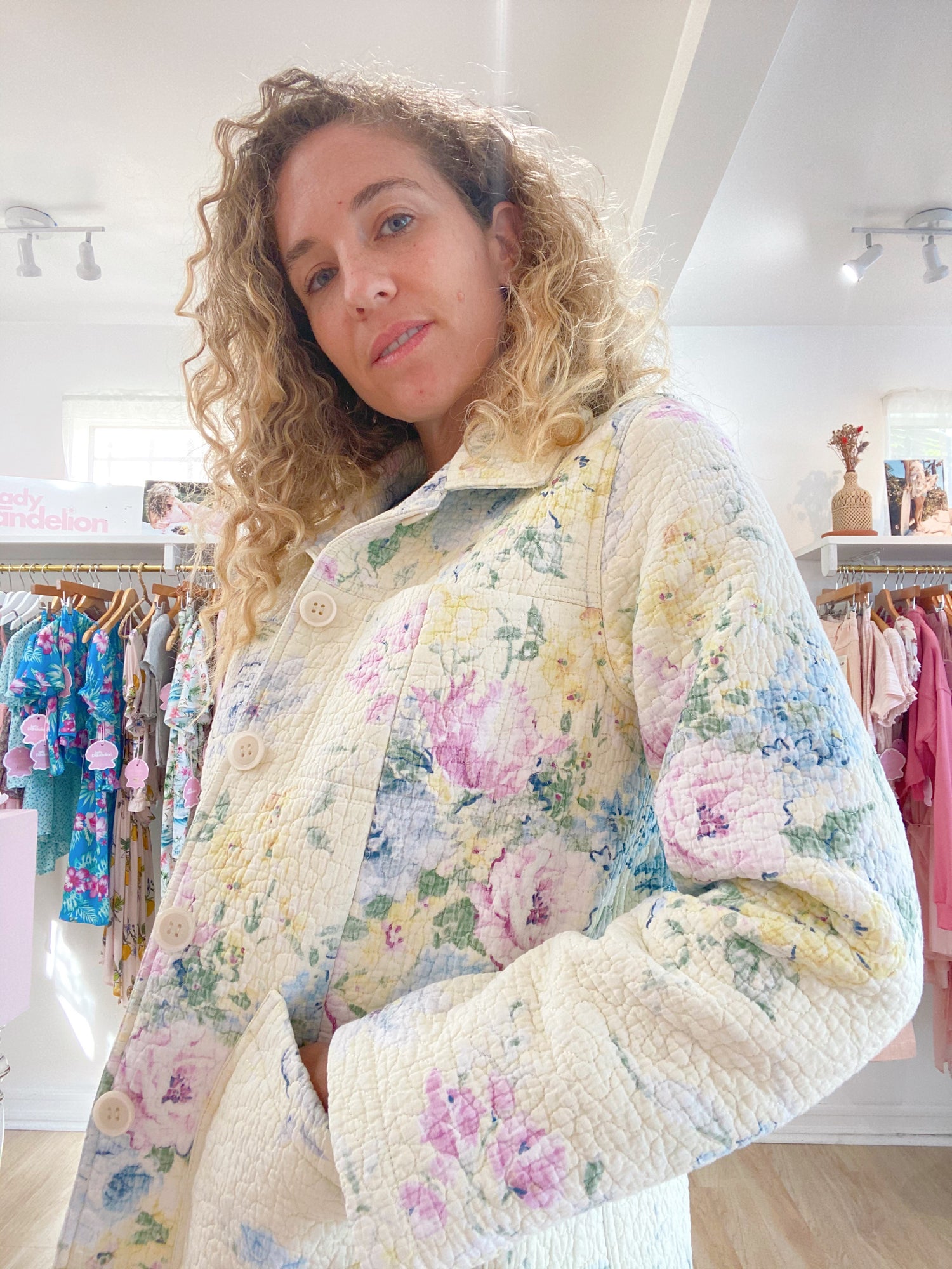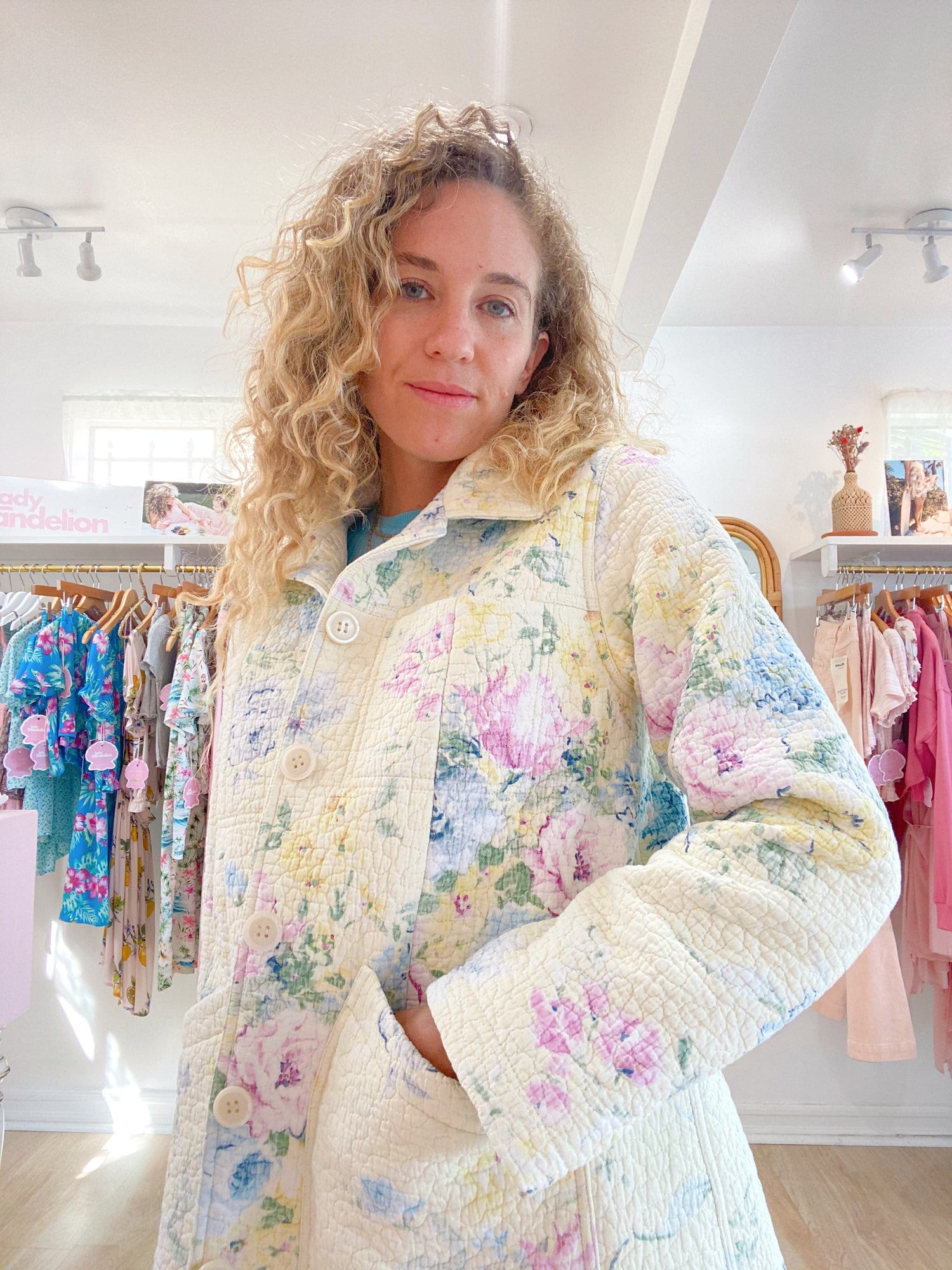 Our first one of a kind full quilt jacket!! This jacket takes up one full quilt of fabric and is stunning from all angles. Fabric is in perfect condition. Beautiful colors of pale yellow, blue and pink flowers. Features 4 front pockets. Fits a size 4/6 perfectly. Can be worn oversized on smaller sizes.